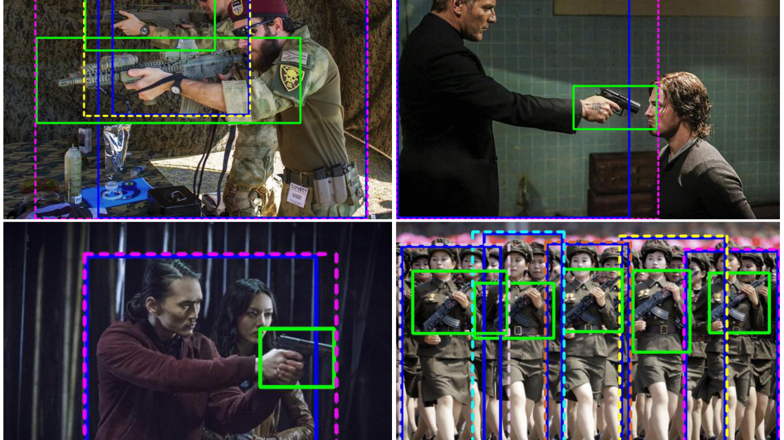 Gunmen in a crowd is a challenging problem, that requires resolving the association of a person with an object (firearm). We present a novel approach to address this problem, by defining human-object interaction (and non-interaction) bounding boxes. In a given image, human and firearms are separately detected.